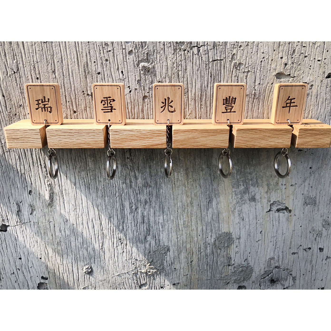 造型與數量說明:5個木頭鑰匙圈,搭配1個木頭壁架。