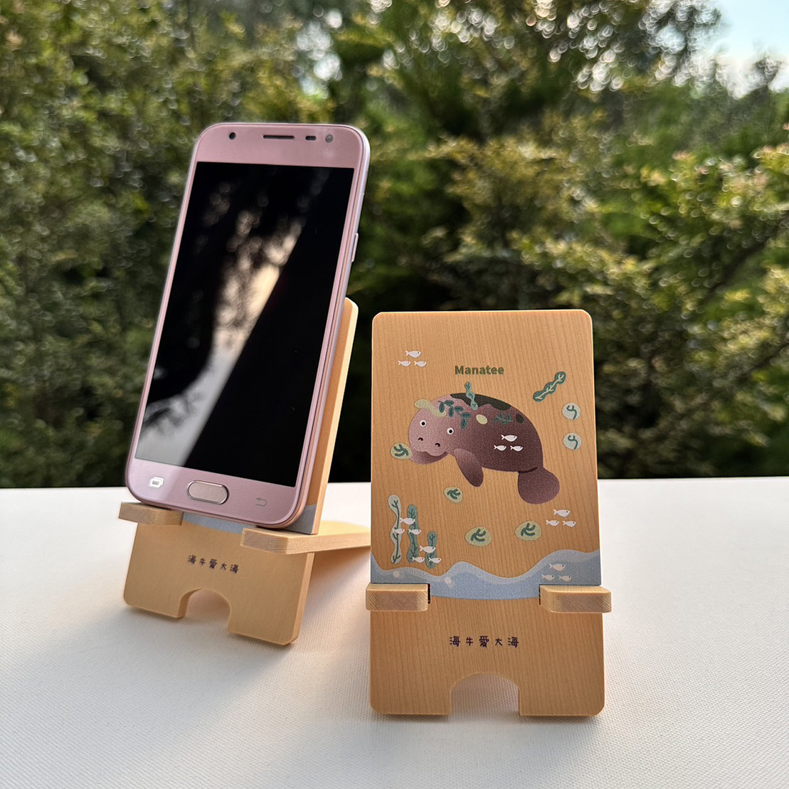 重現在溫暖的原木片上,還能當成手機架,一舉二得。