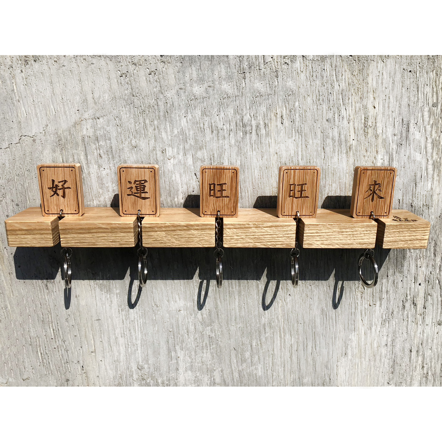 造型與數量說明:5個木頭鑰匙圈,搭配1個木頭壁架。